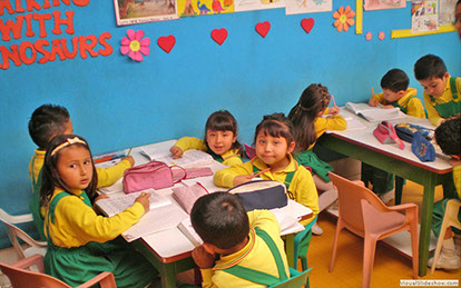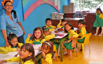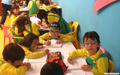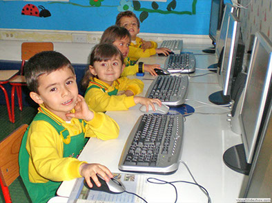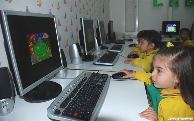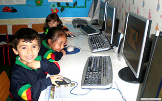 Aula interactiva donde niños y niñas hacen uso de la tecnología como un medio de aprendizaje divertido y atractivo.